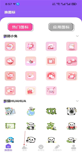 1、启动软件后,进入图标更换页面,浏览热门图标样式,点击壁纸选项切换至静态壁纸界面。