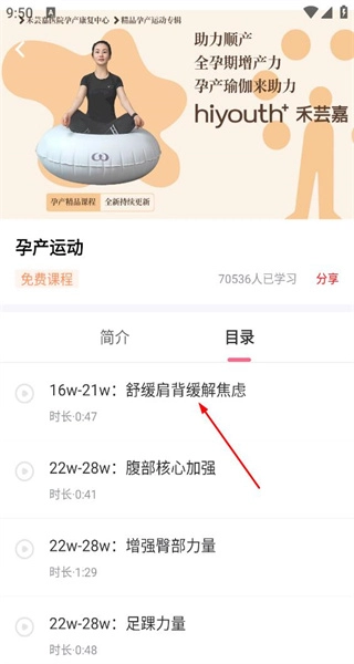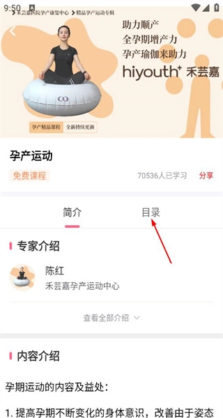 2、进入孕产运动课程页,看到专家介绍等内容,点击目录标签切换到课程章节列表。