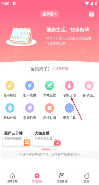 1、打开软件后,进入备孕篇页面,查看各类功能入口,点击孕产运动进入对应课程页面。