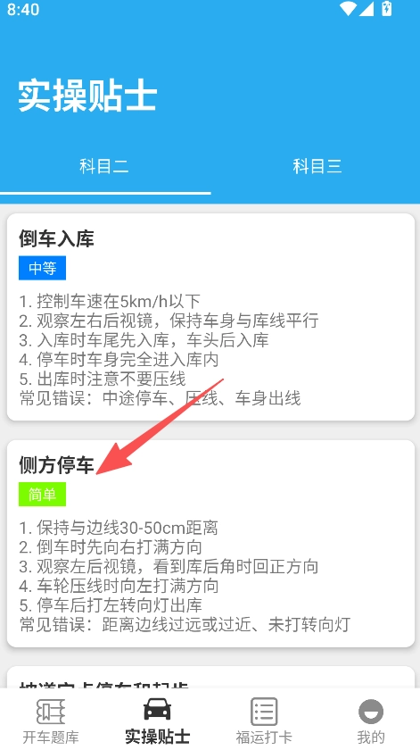 2、点击实操贴士,选择科目二或三,查看倒车入库、侧方停车等实操步骤。