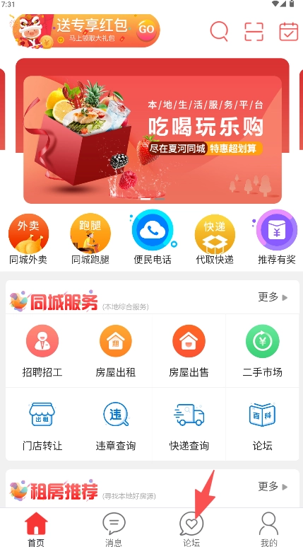 1、该平台定位是综合性本地生活服务平台,采用红色作为主视觉基调,业务内容涵盖外卖、跑腿、招聘、租房等用户高频生活需求。