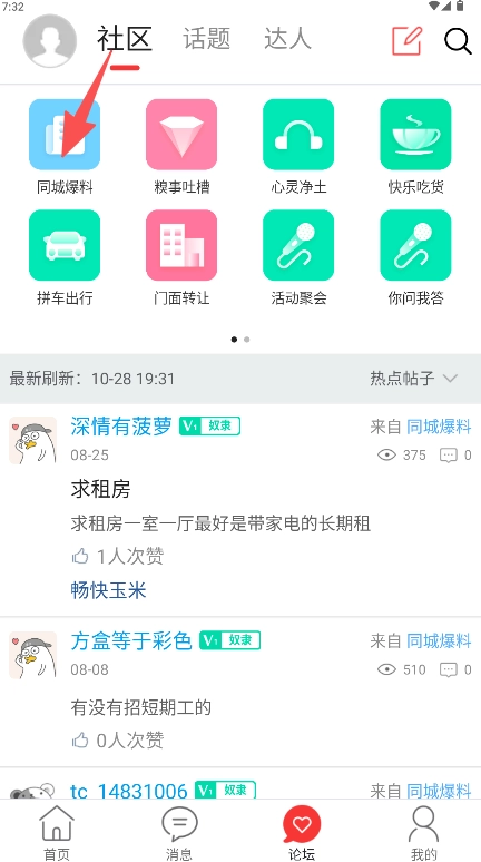 2、在社区页面挑选具体板块,比如点击“同城爆料”的功能入口。
