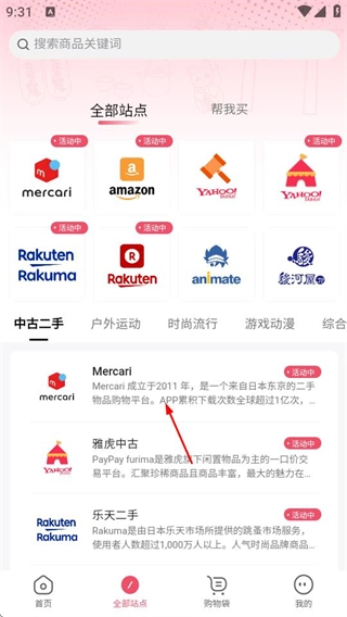 2、在全部站点页面,选择Mercari站点,进入站点详情页面。