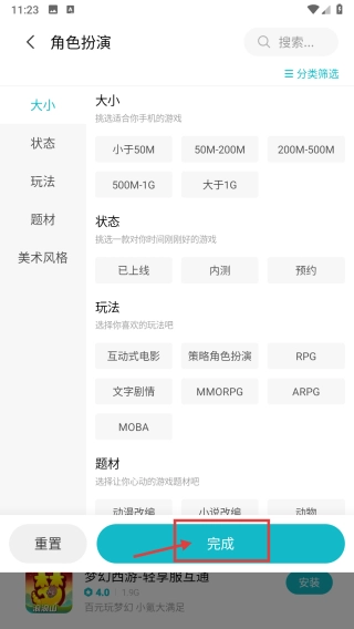 3、在角色扮演游戏列表页面,完成筛选操作后点击完成按钮,以确认所设置的筛选条件。