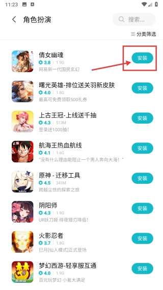 4、在筛选后的游戏列表里,找到倩女幽魂游戏,点击它旁边的安装按钮,即可启动游戏安装流程。
