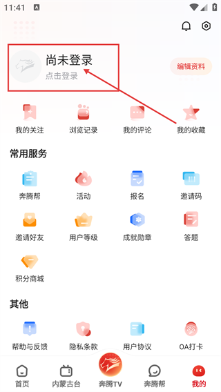 1、在奔腾融媒首页点击底部的【我的】按钮,首页包含直播、联播等板块,点击后可进入个人中心页面。