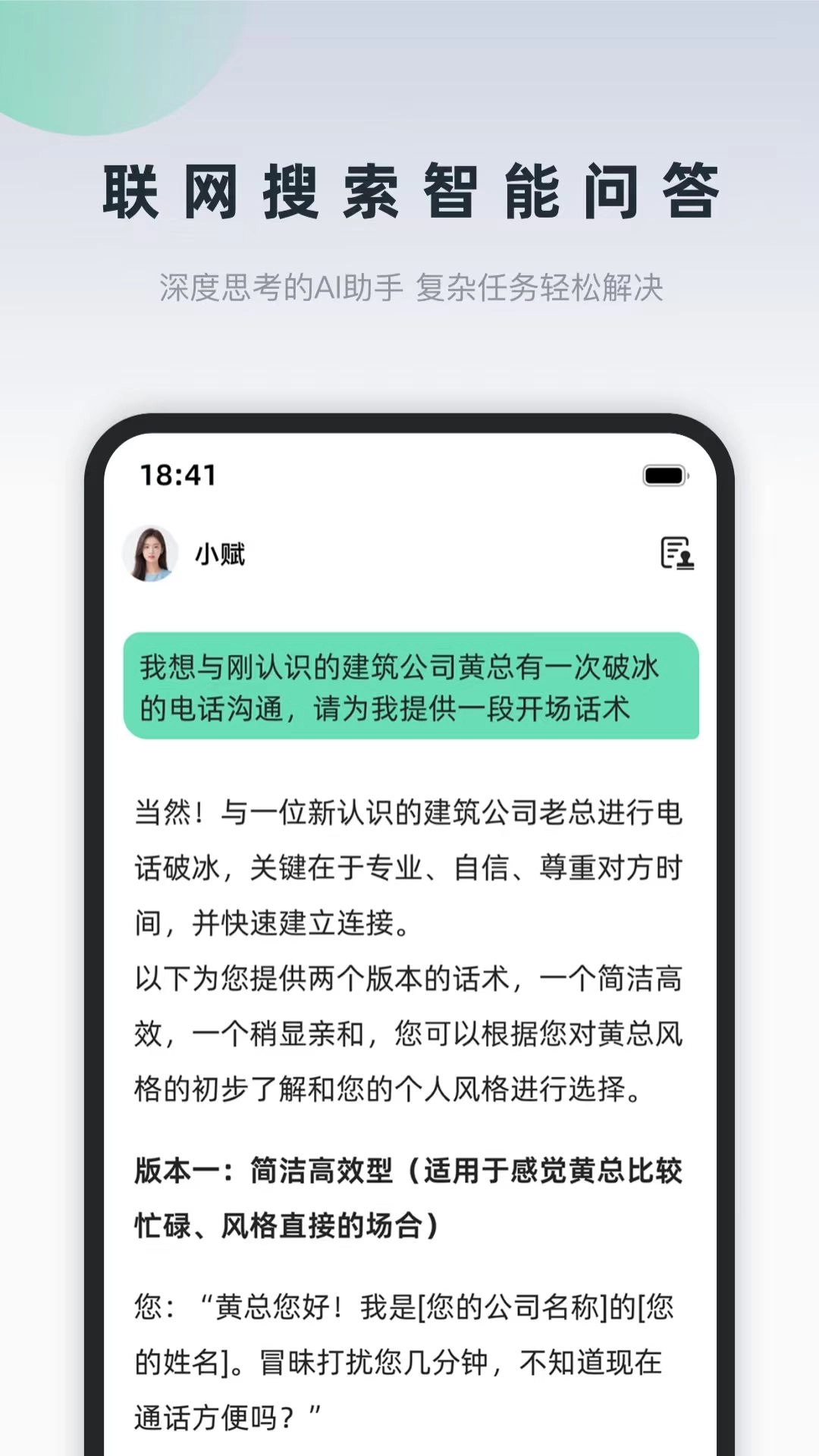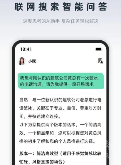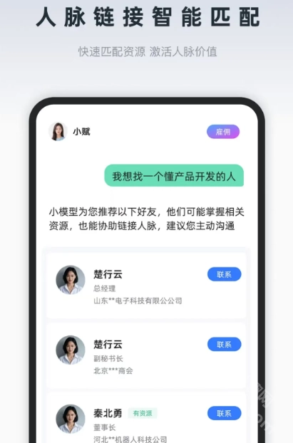 询赋是一款国内首创的AI数字名片人脉拓展助手。这个询赋软件在传统的人脉社交中融入高科技的AI技术,打造出带来更加智能的AI名片制作服务,通过一句话就能快速制作专属名片。并且询赋AI办公助手还能帮你找人脉、找资源,只需要一句话,AI助手就能为你推送相关信息,就像一个随时陪伴在身边的虚拟秘书!