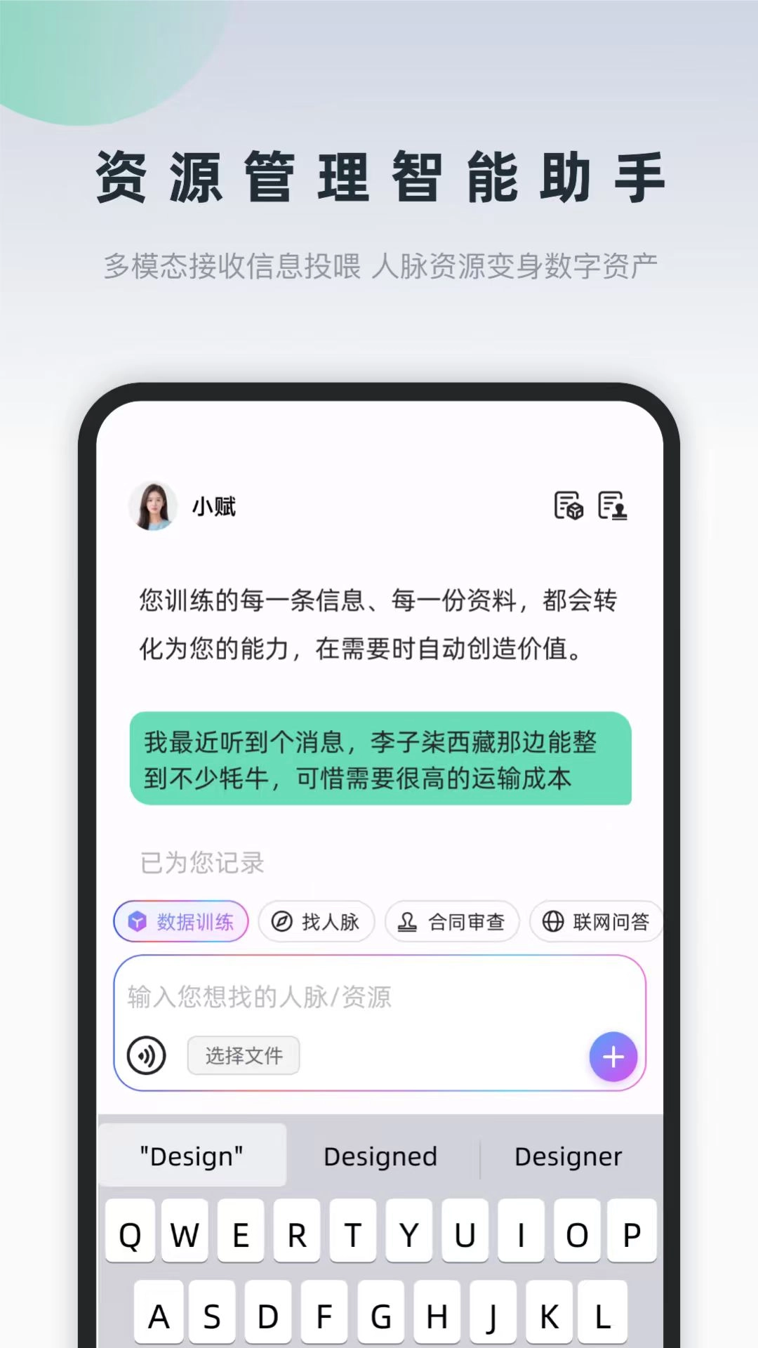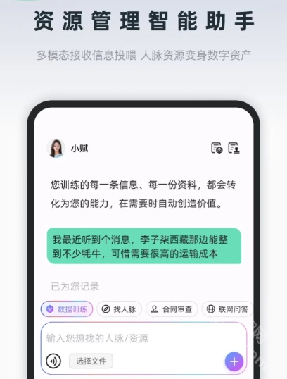 训练专属AI助手“小赋”,通过上传证书、案例等资料,自动学习资源并匹配无限商机