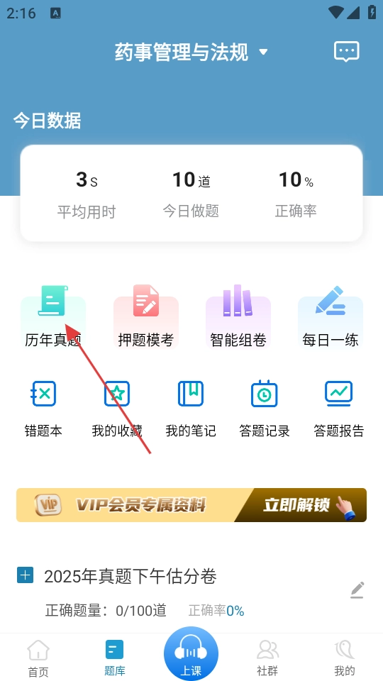 2、在题库页面,点击【历年真题】功能入口,可查看历年考试真题。