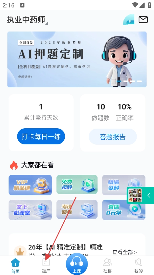 1、在软件底部导航栏点击【题库】,可进入题库功能页面。