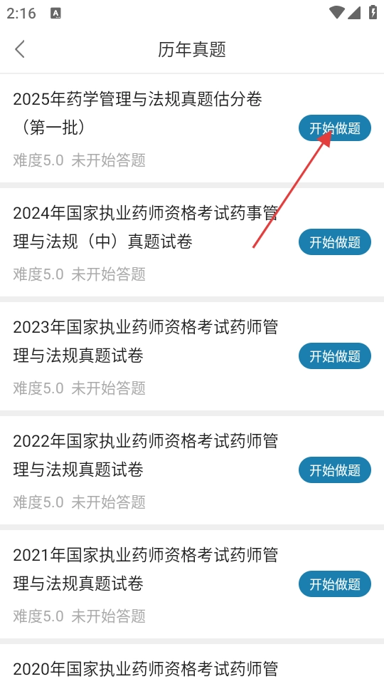 3、在历年真题页面,选择想要做的真题卷,点击【开始做题】即可进入答题界面。