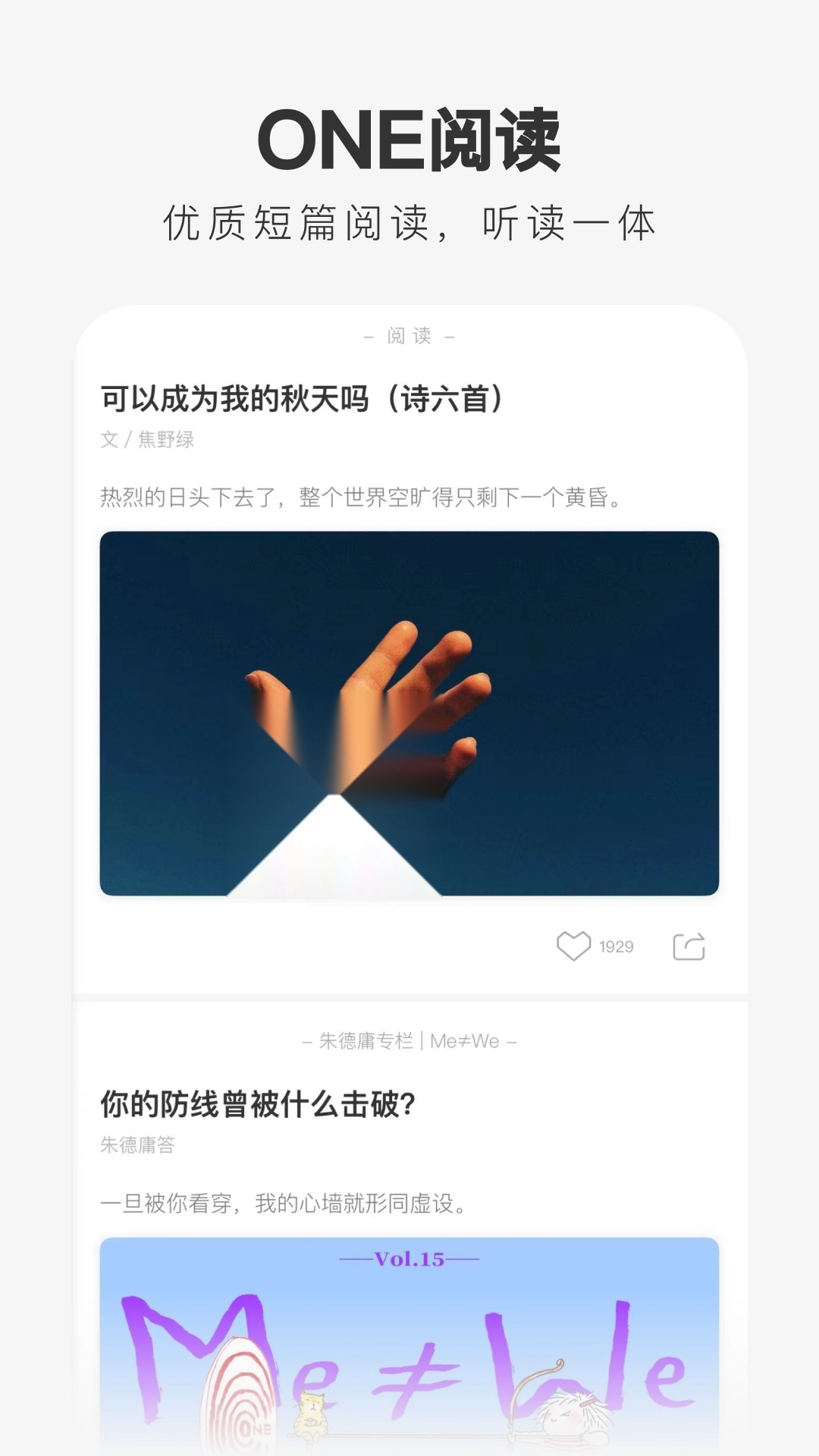1也就是大家耳熟能详的noe一个,这是一款非常深受年轻人喜欢的手机阅读软件,不管是界面还是其他方面都比较偏文艺,最大的特色就是每天只推送一篇内容,相比同行的阅读软件更能抓住用户的心理,现在碎片化时间太重要了,大量的文章大家不一定能坚持阅读完,而1则每天一篇内容阅读起来会更加没压力。