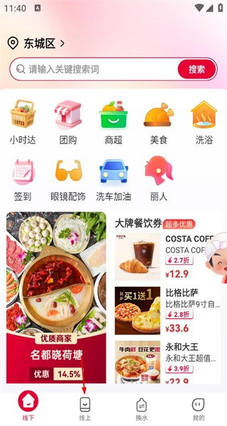 打开软件进入首页后,能看到小时达、团购等功能选项,点击“线上”即可进入商品列表页面。