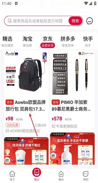 2、进入线上商品页面后,能看到精选、淘宝等标签,可浏览各类商品,之后点击京东品质好货标签。