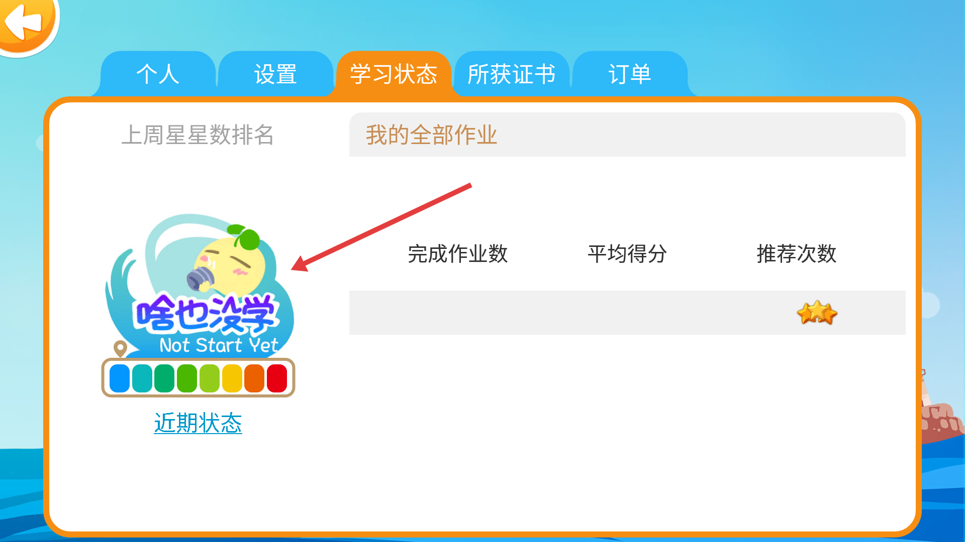 3、在【学习状态】页面,既能查看近期学习状态(例如“啥也没学”),也可以查看完成作业数量、平均得分等学习相关数据。