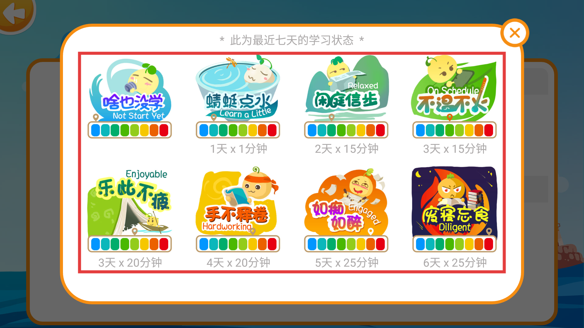 4、点击学习状态区域,会弹出一个说明窗口,该窗口展示了最近七天内不同学习时长所对应的状态标识,例如“1天×1分钟”对应的状态标识为“蜻蜓点水”。