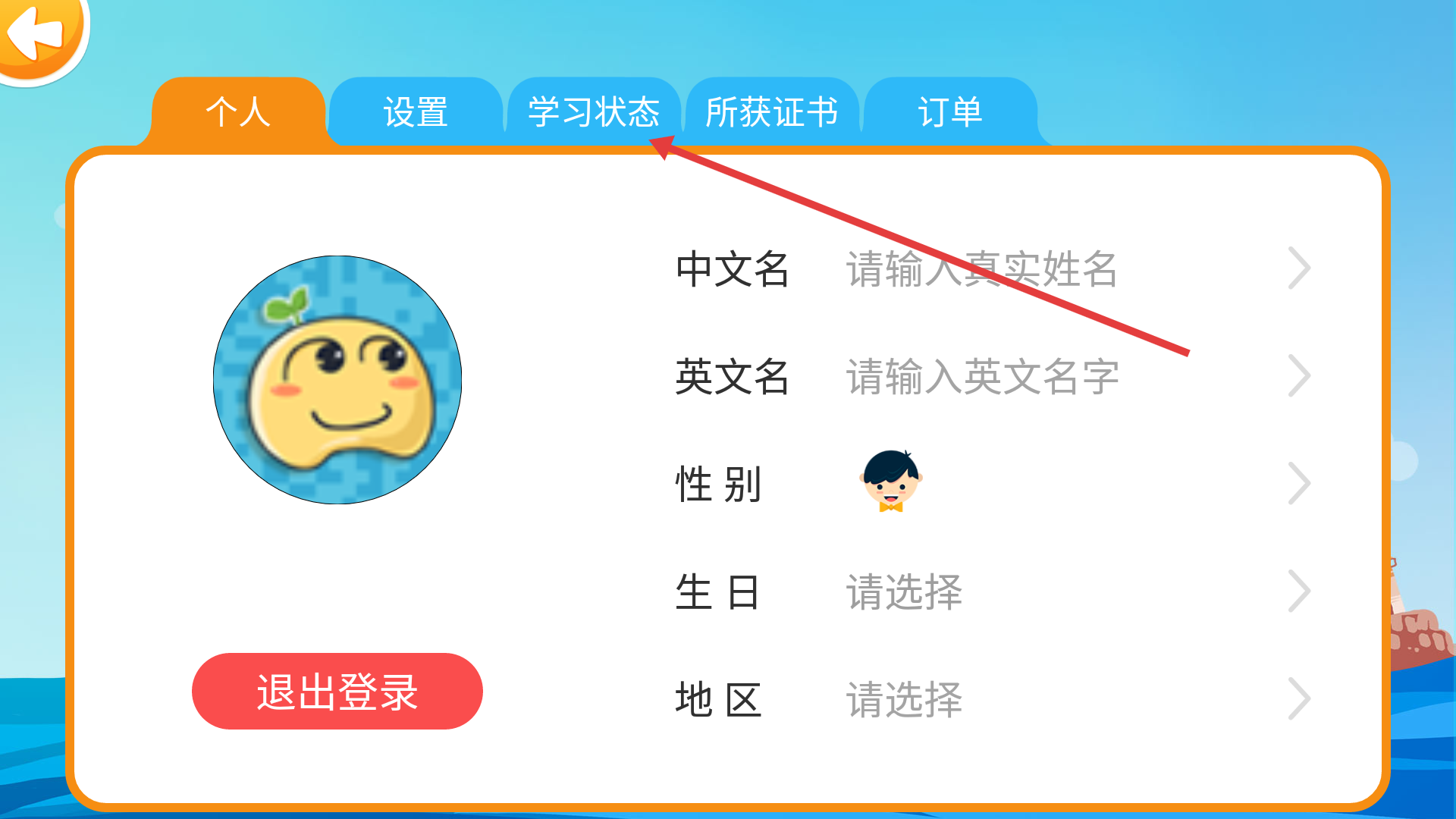 进入个人中心后,在【个人】标签页能够填写姓名、性别等相关信息,点击顶部的【学习状态】标签,即可切换到学习数据页面。