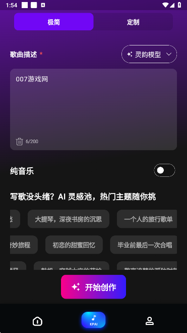 KP音乐是一款功能强大的智能音乐创作软件,流行、古风、电子、摇滚等多种风格的音乐模板。你只需挑选治愈、青春、快乐、悲伤等情绪关键词,或是输入一段文字描述——比如海边、夜晚这类场景描绘,点击生成按钮后,系统便会依据你选定的风格与关键词,自动生成对应的歌曲。