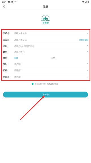 3、进入【注册】页面,依次填写【手机号】【验证码】【密码】等相关信息,勾选对应的协议条款后点击【下一步】按钮,即可完成账号注册的全部流程。