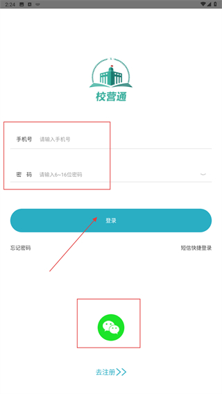 1、进入【校营通】的登录页面后,可输入【手机号】和【6至16位的密码】进行登录,也能点击【微信】图标,通过相应的微信登录方式完成操作。