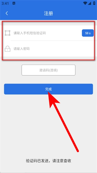 4、输入手机短信验证码与密码,点击完成按钮,即可完成注册流程。