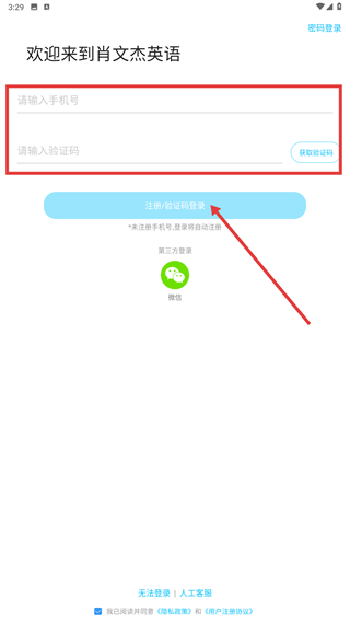 3、切换至验证码登录页,输入【手机号】后点击【获取验证码】,填入验证码再点【注册/验证码登录】,完成登录或注册。