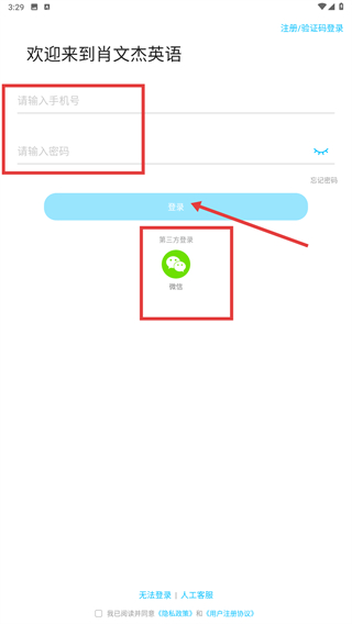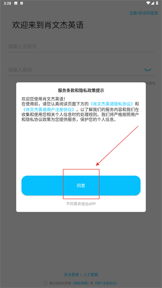 1、阅读《肖文杰英语隐私协议》《肖文杰英语用户注册协议》后,点击【同意】按钮,确认服务条款以继续使用应用。