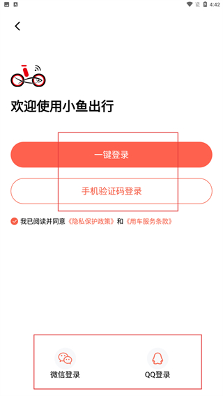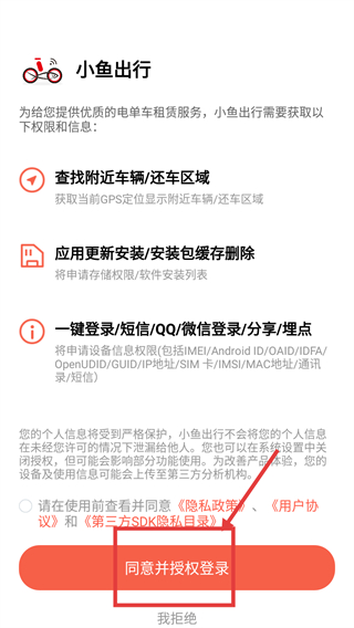1、阅读《隐私政策》《用户协议》后,勾选同意选项,点击【同意并授权登录】按钮,完成权限授权以使用小鱼出行服务。