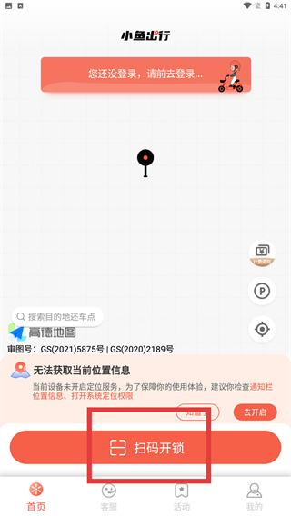 4、登录后在首页点击【扫码开锁】按钮,扫描电单车上的二维码,即可开启车辆使用(需确保设备定位权限已开启)。