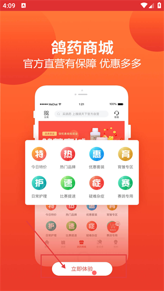 1、在鸽药商城引导页点击【立即体验】按钮,该页面展示鸽药商城直营的特点,点击后进入应用主界面。