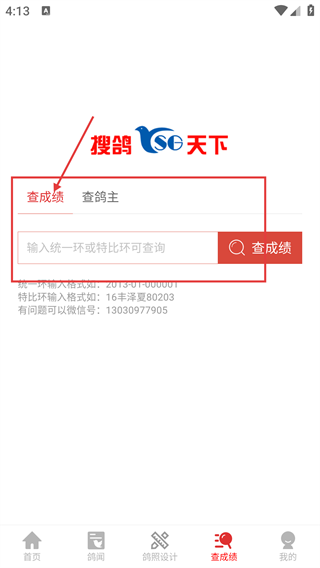 3、进入查成绩页面,默认选中【查成绩】标签,在输入框填写统一环或特比环,点击【查成绩】按钮查询对应赛鸽的成绩信息。