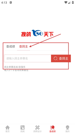 4、切换至【查鸽主】标签,在输入框填写鸽主参赛名,点击【查鸽主】按钮查询对应鸽主的相关信息。