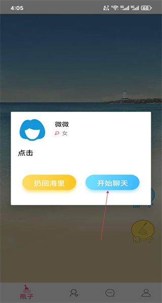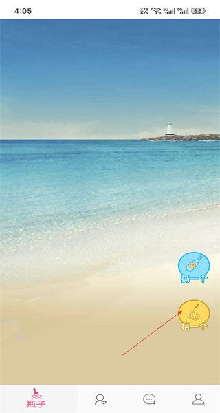 2、进入瓶子页面,看到海滩背景及相关按钮,点击对应按钮获取一个包含用户信息的瓶子。
