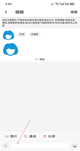 4、进入聊天页面,查看对方资料,可在底部输入框输入内容,开启与该用户的聊天互动。