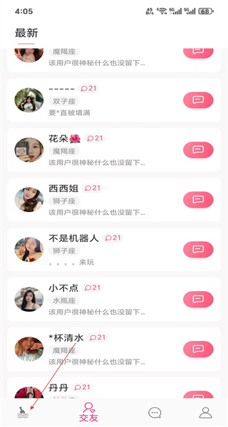 1、打开软件后,进入最新列表页,点击底部瓶子选项,切换到瓶子互动的功能页面。