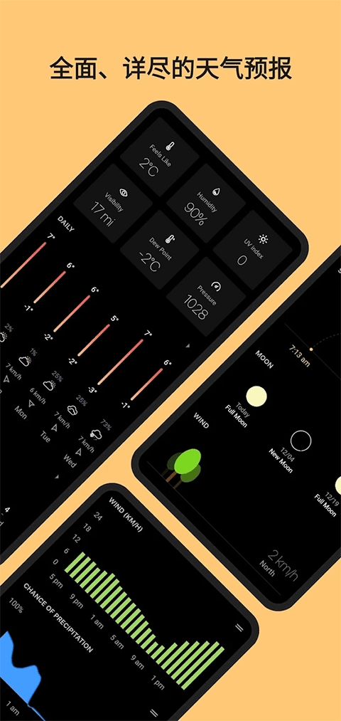 3、全面涵盖空气质量、紫外线、花粉指数等与健康相关的数据,同时呈现日出日落、满月、体感温度等多种实用气象要素。