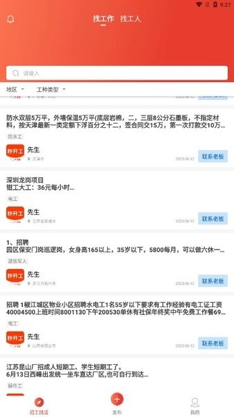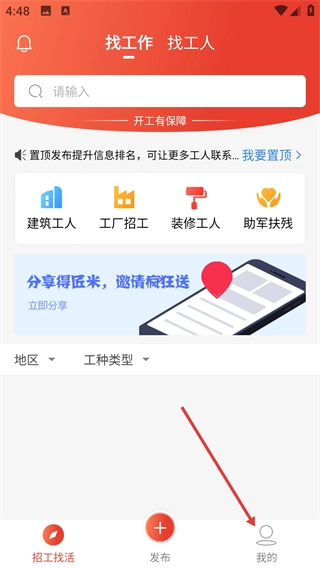 1、在“找工作 找工人”主页面,点击底部【我的】按钮,可进入个人中心,该页面支持搜索职位、选择工种类型等功能。