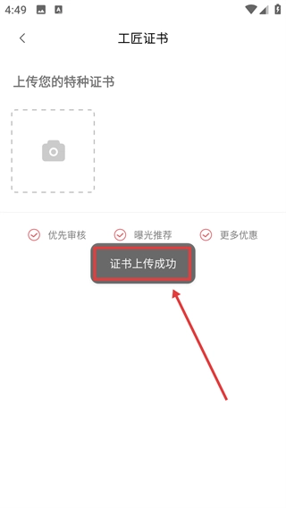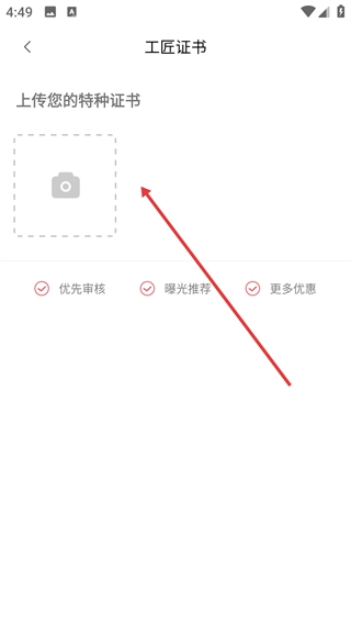 3、在工匠证书页面,点击“上传您的特种证书”区域的相机图标,可选择并上传对应的证书文件,上传后可享受优先审核等权益。