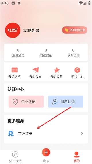 2、进入个人中心后,在“更多服务”板块点击【工匠证书】选项,可进入证书上传页面,该页面还包含认证中心等功能入口。