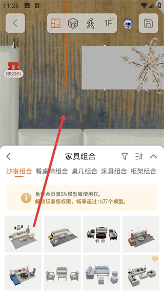 4、我们可以在家具组合板块选择【沙发组合】等家具,将其拖入户型中,轻松布置出理想家居场景哟。