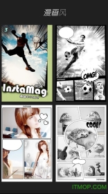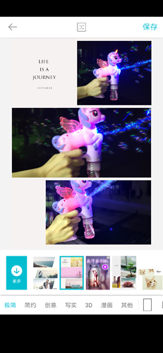 杂志拼图是需要选择1-9张照片,然后点击“开始”按钮,在这里可以看到各种风格的拼图方式,极简、简约、创意、写实、漫画等,每一个风格中都有好几个模板供大家选择,拍出杂志范,做一个杂志大片女神/男神。
