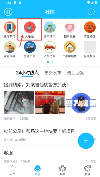 1、启动江汉热线应用,点击底部的社区选项,进入社区板块页面。