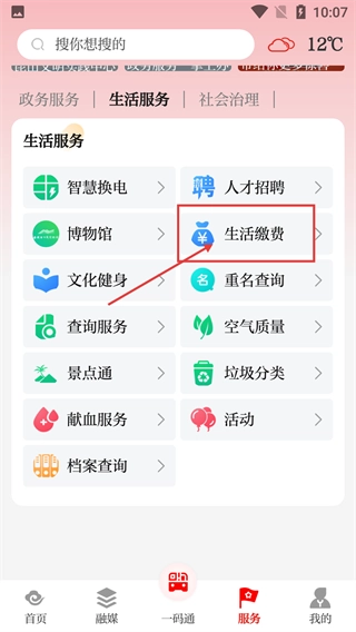 2、在服务页面的生活服务板块,找到【生活缴费】选项,该板块还涵盖智慧换电-人才招聘等生活类服务。