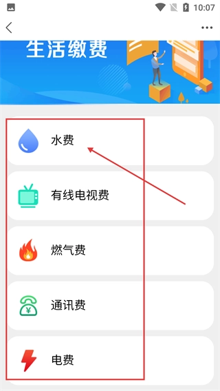 3、进入生活缴费页面后,可选择【水费】等缴费项目,该页面包含水费-电费等多种生活费用的缴纳入口。