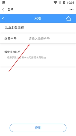 4、进入水费缴费页面,需填写【缴费户号】,该页面适用于昆山自来水公司居民水费缴纳,输入后可点击查询。