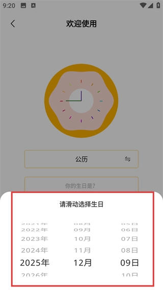 4、点击生日输入框后,会弹出日期选择器,滑动选择对应的年-月-日,就能完成生日信息的填写进行计算啦。