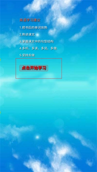 1、阅读【英语学习建议】后,点击【点击开始学习】按钮,进入教材选择界面,开启英语学习流程。