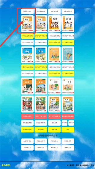 2、在教材列表,选择对应学段的教材(如【三年级上册-英语】),进入该教材的单元选择页面。