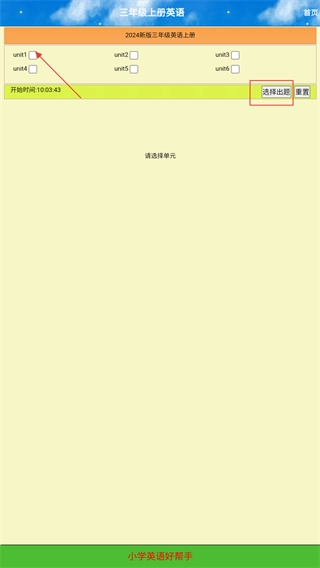 3、在【三年级上册-英语】界面,勾选目标单元(如unit1),点击【选择范围】按钮,确定学习单元。