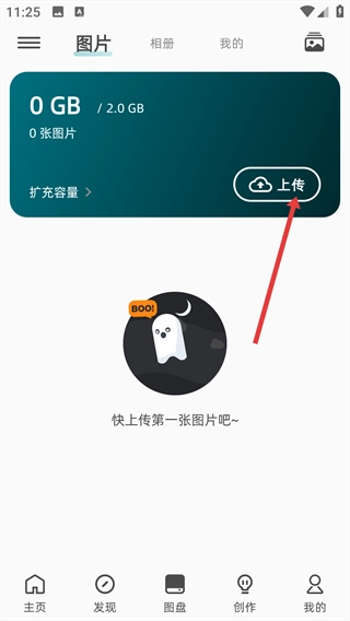 2、在图盘页面,点击右上角的【上传】按钮。